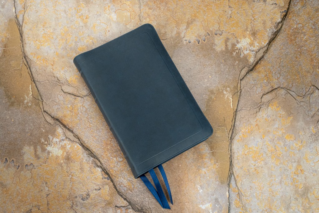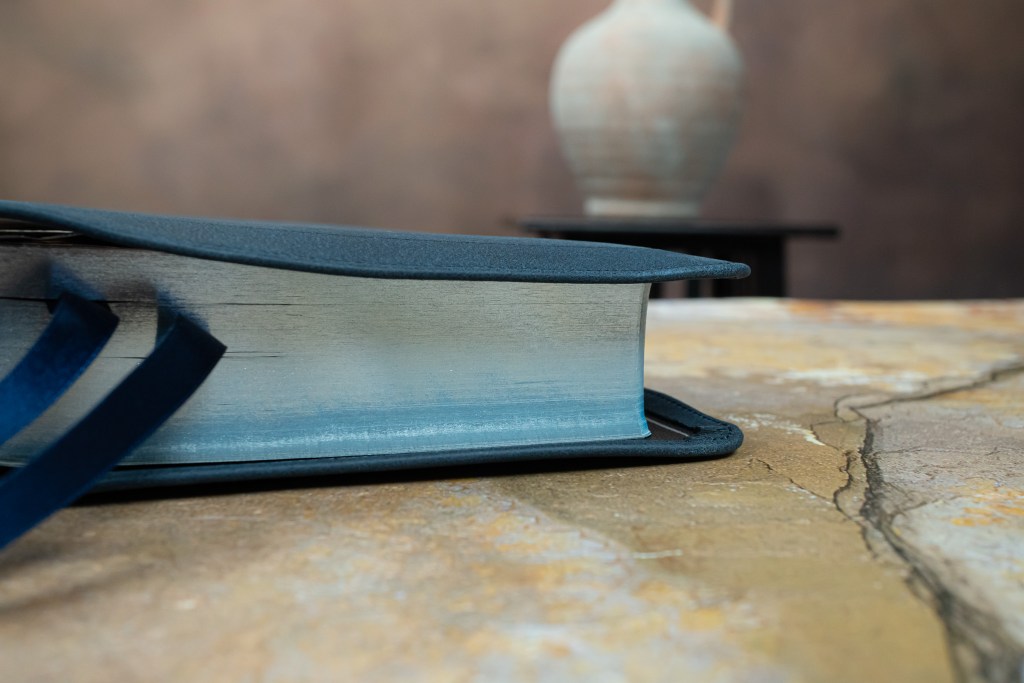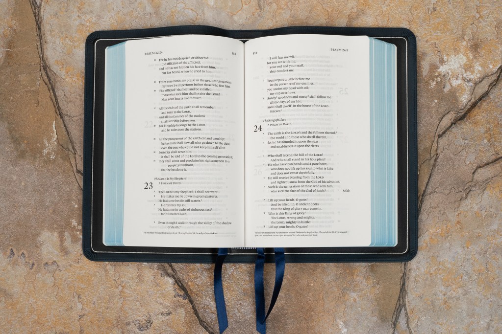 The Smyth-sewn binding allows this Bible to fall open and lay flat from Genesis to Revelation. It has color maps, footnotes, line matched print to reduce ghosting, a 17 mm yapp, blue under silver art gilt, and three ribbons (for the Prussian blue the ribbons are navy).