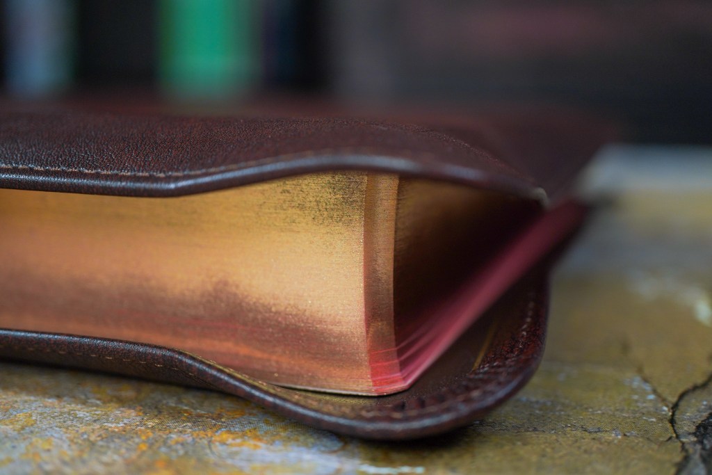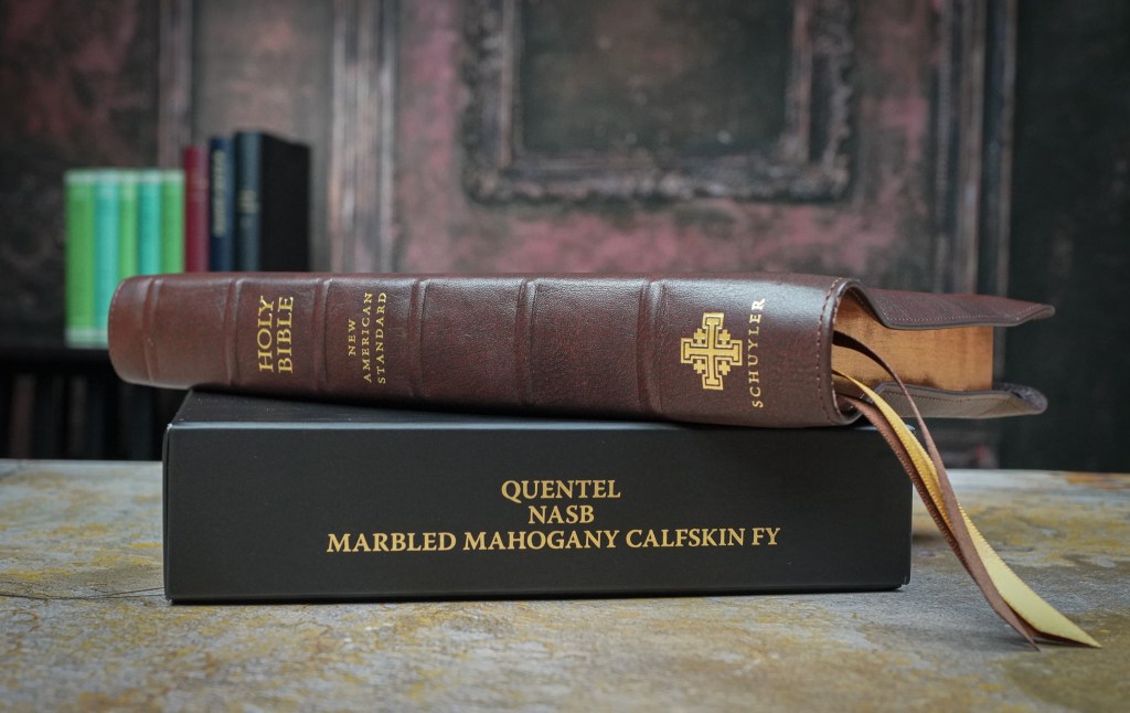 The realm of beautifully crafted Bibles welcomes an extraordinary addition – the Schuyler NASB95 in Full Yapp Marbled Mahogany Calfskin (although other colors are available from Schuyler as well as two sizes, a wide margin version, and the NASB20 Schuyler Stridon in single column, verse-be-verse typeset).