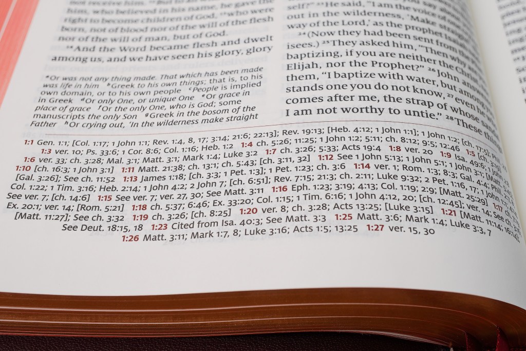 Also, while the cross-references are still there, the numbering for the cross-references has changed. Instead of the small letters within the body of the text after a word indicating a cross-reference, the cross-references are listed with the verses they reference in the footnotes. This removes the unnecessary lettering within the text which can sometimes take away from the reading experience. Now the footnotes lists the verse in the same accent color that highlights the drop caps. To me, this is a wonderful improvement. Likewise, apart from the verse numbers, small letters after a word or verse are references to textual notes from the translators. This allows the reader to also where there are textual or translational differences.