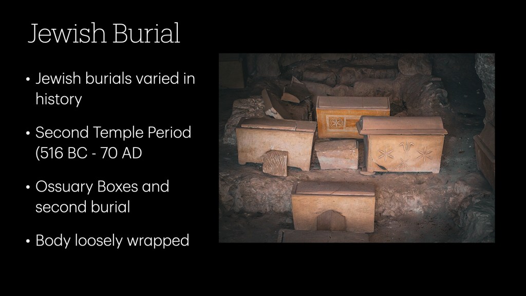 Remember, Jewish burial practices varied throughout history. But during the Second Temple period—from 516 BC to 70 AD—there were specific customs, including the use of ossuary boxes for secondary burial and the practice of wrapping the body loosely in linen.