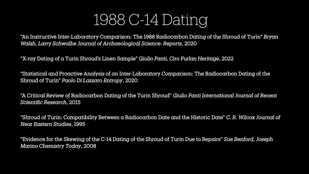 This slide comes directly from my paper Sacred Threads: The Shroud of Turin in Scriptural and Jewish Context, where I compiled the results of multiple scientific dating methods applied to the Shroud. It visually compares five independent tests—Raman spectroscopy, FTIR, vanillin content, tensile strength, and WAXS—each placing the Shroud’s origin well within the first century, overlapping the timeframe of Christ’s crucifixion. In stark contrast, the 1988 C-14 test appears as an outlier, isolated in the medieval period. This chart underscores the growing scientific consensus that the Shroud’s true age may align far more closely with the historical Jesus than with any medieval forgery theory.