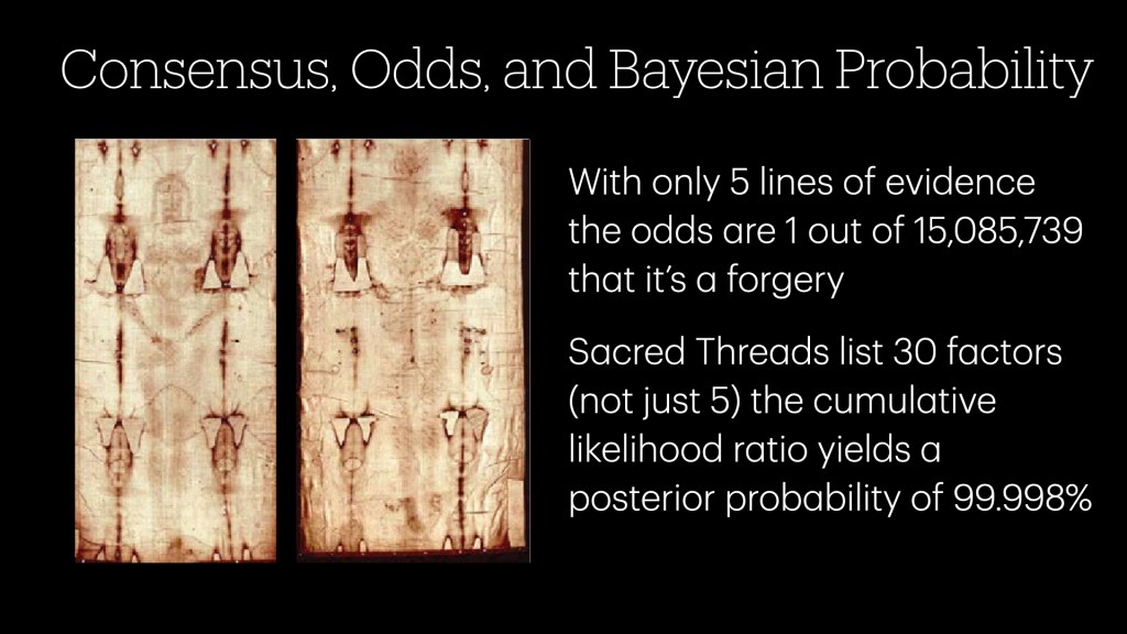 This slide brings everything together by showing why the Shroud’s evidence must be weighed cumulatively, not in isolation. Each individual piece—whether forensic, historical, textile, botanical, or chemical—points in the same direction, but when combined, they form an overwhelming case for authenticity. Bayesian probability provides a framework for this cumulative assessment. It’s a tool widely used in science and law to update the odds as new evidence is added. In Sacred Threads, I go into greater detail on this analysis, showing how even with just five lines of evidence, the odds of forgery shrink to 1 in over 15 million. When all thirty factors from the paper are considered, the cumulative likelihood ratio yields a posterior probability of 99.998%. At that level, the question shifts from “Why believe?” to “Why doubt?”—because this isn’t about blind faith, but a rational response to the converging weight of evidence.