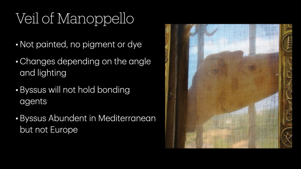 This slide highlights the extraordinary and puzzling nature of the Veil of Manoppello. Microscopic studies have revealed no trace of pigment, dye, or bonding agents on the fibers—meaning the image was not painted, printed, or applied in any conventional way. Even more astonishing, the image seems to shift depending on lighting and viewing angle—sometimes fading into near invisibility, other times appearing almost three-dimensional. This phenomenon is partly due to its composition: the veil is made of byssus, or sea silk, an ancient Mediterranean fabric so delicate it cannot hold paint or ink. While byssus was prized in antiquity, it was virtually unknown in medieval Europe, making it even harder to explain how a supposed medieval forger could have accessed the material and produced such an image without damaging it.