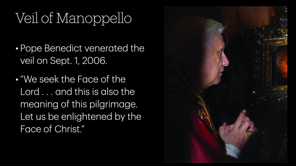In 2006, Pope Benedict XVI made a historic pilgrimage to Manoppello to venerate the Veil. Standing in prayer before the image, he reflected, “We seek the Face of the Lord… and this is also the meaning of this pilgrimage. Let us be enlightened by the Face of Christ.” His words capture the profound spiritual impact this mysterious cloth continues to have, drawing people from all traditions to contemplate the possibility of gazing upon the human face of God.